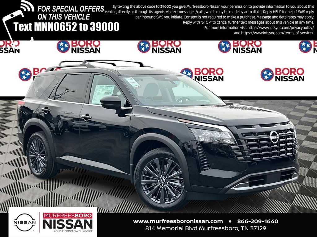 Super Black 2026 Nissan Pathfinder SL 4WD 9-Speed Automatic 3.5L V6 DOHC CAPTAINS CHAIRS, APPLE ANDRIOD CAR PLAY, REAR BACKUP CAMERA, BLUETOOTH, 4WD, ABS brakes, Active Cruise Control, Alloy wheels, Electronic Stability Control, Front dual zone A/C, Heated door mirrors, Heated Front Bucket Seats, Heated front seats, Illuminated entry, Low tire pressure warning, Power Liftgate, Remote keyless entry, Traction control, 18" Machined Alloy Wheels, 3rd row seats: bench, 4-Wheel Disc Brakes, 6 Speakers, Air Conditioning, AM/FM radio: SiriusXM w/360L, Auto High-beam Headlights, Auto-dimming Rear-View mirror, Automatic temperature control, Brake assist, Bumpers: body-color, Delay-off headlights, Driver door bin, Driver vanity mirror, Dual front impact airbags, Dual front side impact airbags, Emergency communication system: NissanConnect Services, Four wheel independent suspension, Front anti-roll bar, Front Bucket Seats, Front Center Armrest, Front reading lights, Fully automatic headlights, Garage door transmitter: HomeLink, Heated steering wheel, Knee airbag, NissanConnect featuring Apple CarPlay and Android Auto, Occupant sensing airbag, Outside temperature display, Overhead airbag, Overhead console, Panic alarm, Passenger door bin, Passenger vanity mirror, Power door mirrors, Power driver seat, Power steering, Power windows, Radio data system, Radio: AM/FM Audio System with NissanConnect, Rear air conditioning, Rear anti-roll bar, Rear reading lights, Rear seat center armrest, Rear side impact airbag, Rear window defroster, Rear window wiper, Reclining 3rd row seat, Security system, Speed control, Speed-sensing steering, Split folding rear seat, Spoiler, Steering wheel mounted audio controls, Tachometer, TailorFit Appointed Seating Surfaces, Telescoping steering wheel, Tilt steering wheel, Trip computer, Turn signal indicator mirrors, Variably intermittent wipers, SUNROOF, THIRD ROW, LEATHER, NAVIGATION, ALLOY WHEELS, 4WD, ABS brakes, Active Cruise Control, Alloy wheels, Electronic Stability Control, Front dual zone A/C, Heated door mirrors, Heated Front Bucket Seats, Heated front seats, Illuminated entry, Low tire pressure warning, Power Liftgate, Remote keyless entry, Traction control.